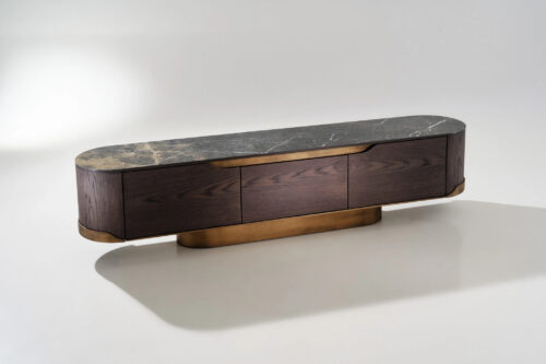 Το έπιπλο τηλεόρασης ECHO είναι κατασκευασμένο από δρύ, με πόδια από μασίφ ξύλο ενώ οι καμπύλες στις γωνίες ολοκληρώνουν τη σύνθεση, προσφέροντας μια ήπια, χειροποίητη αισθητική . Η μεταλιζέ λεπτομέρεια έρχεται να προσθέσει τη δική της υπογραφή∙ ένα διακριτικό φως που αντανακλά την προσοχή στη λεπτομέρεια και φέρνει μια πινελιά μοντέρνας κομψότητας.